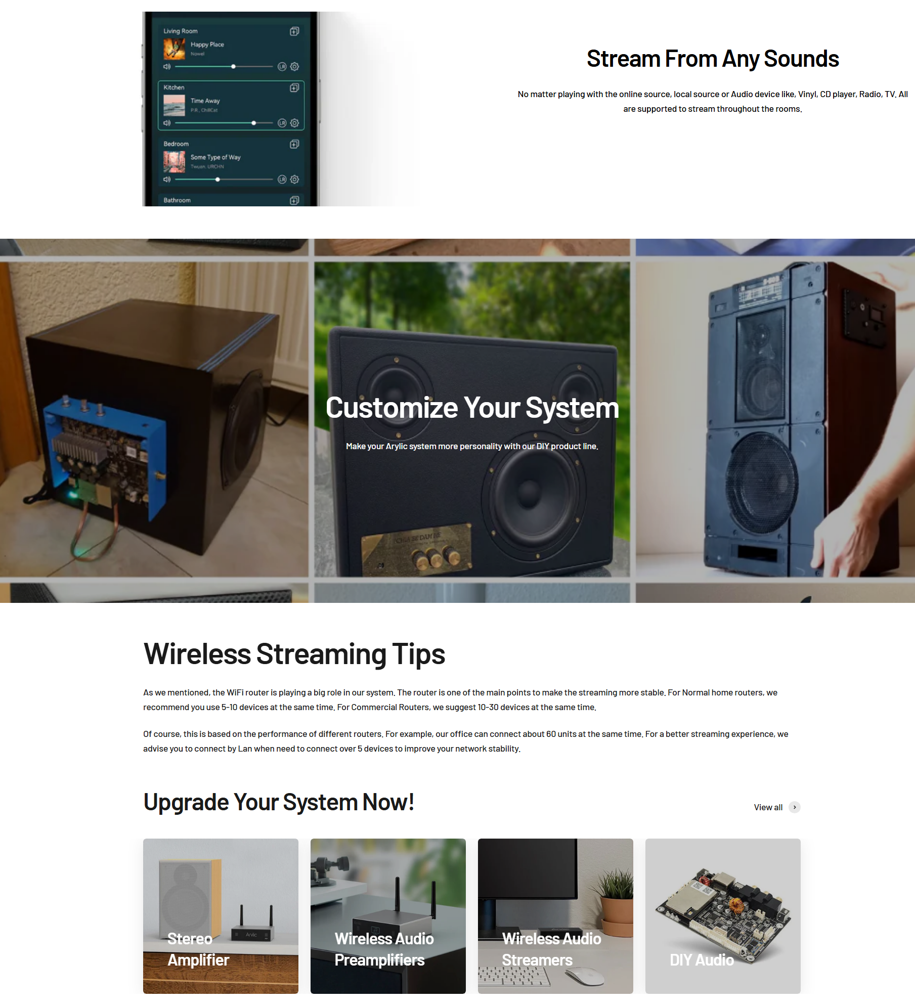 Our wireless streaming system allow you to stream your online music, local music, or any audio sourses to your any kind of speakers in your rooms via WiFi, Airplay or Bluetooth. Sync Audio or play different music at the same time to your rooms with Arylic units set into the rooms.