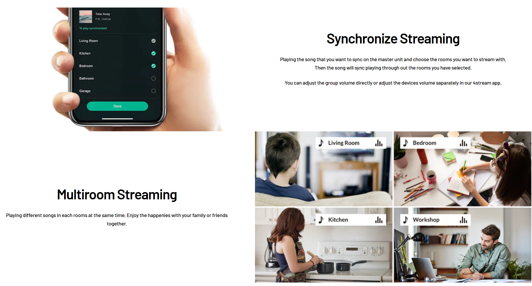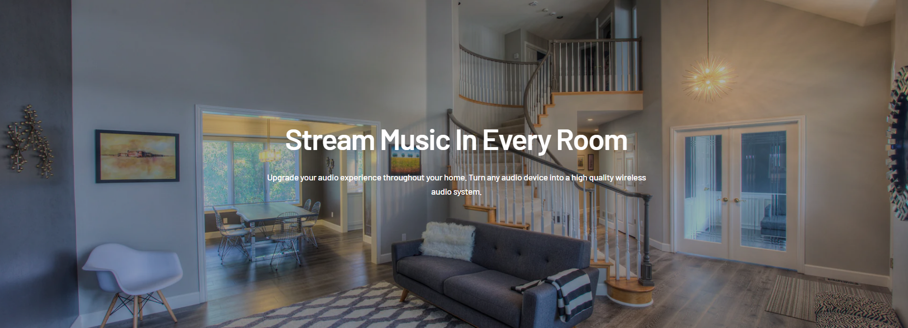 Our wireless streaming system allow you to stream your online music, local music, or any audio sourses to your any kind of speakers in your rooms via WiFi, Airplay or Bluetooth. Sync Audio or play different music at the same time to your rooms with Arylic units set into the rooms.